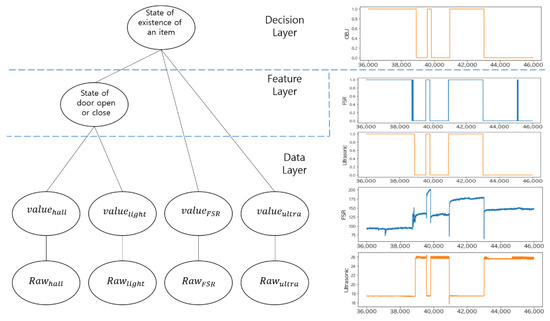 For multi-sensor data fusion of the smart storage, we adopted a three-layer structure: a data layer, feature layer, and decision layer as shown in the left graph of Figure 4. In the data layer, it removes noises that are randomly changing and finds a significant point of data change for each sensor. This remarkable change can be inferred as a state change. A threshold, which is a reference value for judging a state change for each sensor, is obtained through multiple measurements. Based on the threshold, we can distinguish whether a state change has occurred for each sensor. That is, the threshold obtained in the data layer is applied to the measured values () of each sensor and they are converted into the corresponding logical values (), 0 and 1, as shown in the right graph of Figure 4. In the feature layer, features are extracted by combining the raw data of two different sensors that are related in terms of functionality.