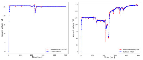 Figure 5 shows the results of smoothing by applying a Kalman filter [27] to the sensed values of the ultrasonic sensor and the FSR sensor. Compared to those of the ultrasonic sensor, the sensed values of the FSR sensor were relatively unstable.