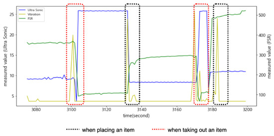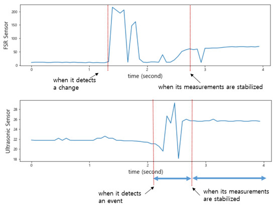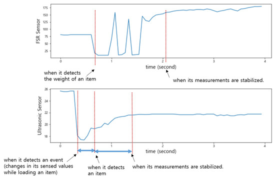 As shown in Figure 7, when an item was put into the smart storage, the ultrasonic sensor detected it or human arms first, generating noise until it was completely placed. On the other hand, when placing it, vibration occurred in the plate, resulting in a drastic change in the sensed values of the FSR sensor. We intentionally installed only one FSR sensor in the center of the plate, so its measured value changed depending on where an item was placed. In addition, the time when its sensed value converged to a stable one varied depending on the location of the item.