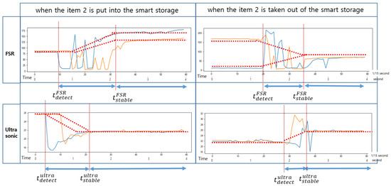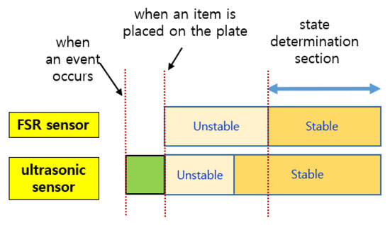As shown in Figure 8, when an event occurs, the sensed values of each sensor change, but the time it takes to stabilize is shorter for the ultrasonic sensor. The FSR sensor requires a longer time to stabilize. Therefore, the reference time for determining the state of the smart storage is not the time when it detects the weight (or pressure) of an item but the time when the values of both sensors are stabilized. In addition, the one that detects an event first when putting an item in is the ultrasonic sensor. In Figure 8, the green rectangle indicates the section where the event occurred. However, the values sensed in this section are useless for state determination.