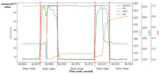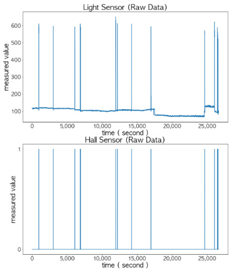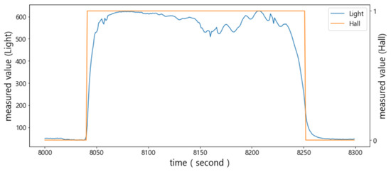 The measured value of the Hall sensor was 1 when the door was closed and 0 when the door was open. Thus, there was no need to specify a threshold for it. Remember that when the door was closed or opened, its values sometimes changed abruptly, repeating 0 and 1, due to the external impacts. Notice that it was determined that the door was closed regardless of its changes when the values of the light sensor were maintained below . Similarly, it was determined that the door was open regardless of its changes when the values of the light sensor were maintained above the threshold of 250.