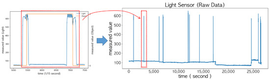 When the door is opened to put an item in or take it out of the storage, a sudden change in the sensed values of the light sensor may occur, because light is blocked by the item or arms. This can easily be identified as shown in the left of Figure 13 when the sampling interval was shortened to 15 times per second. However, if the sampling interval was set to once per second, as shown on the right of Figure 13, the changes in its sensed values exactly matched the status of the door.