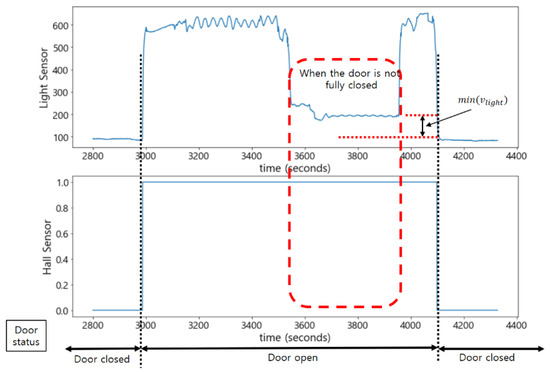 As shown in Figure 14, when the door was not fully closed, it was difficult to accurately determine the status of the door with only the light sensor. This is because its value was close to the one when the door was fully closed. On the other hand, the Hall sensor maintained the measured value 1 when the door was even slightly open; thus, it could compensate for the misjudgment by the light sensor. That is, when the measured value of the Hall sensor was 1, and the measured value of the light sensor was greater than the minimum value, , it was determined that the door was not fully closed.