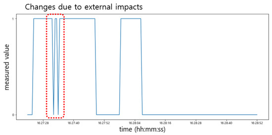 Conversely, as shown in Figure 15, the sensed value of the Hall sensor changed drastically (‘0′→′1′ or ′1′→′0′) due to the external impacts, especially when the door was closed. This sometimes happened when the door was opened. On the other hand, since the sensing values of the light sensor did not change in response to such an impact, it can sufficiently compensate for this phenomenon. For example, if the sensing value of the light sensor is maintained below , it can be determined whether the door is closed regardless of the changes in the Hall sensor.