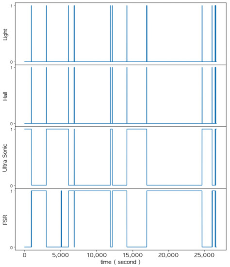 In the data layer, the measurement values of each sensor were refined based on the threshold and converted into corresponding logical values as shown in Figure 19. These logical values of each sensor were used for multi-sensor data fusion in the feature layer and decision layer. Notice from Figure 19, Figure 20, Figure 21, Figure 22, Figure 23 and Figure 24 that the sensed values of each sensor were sampled at an interval of once per second. Thus, the unit of the x-axis in the figures is seconds.