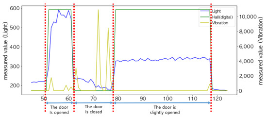 As shown in Figure 20, the change in the measured values between the Hall sensor and the light sensor exactly coincided with the time when the door opening and door closing event occurred. Additionally, the fusion of these two sensors could detect a state in which the door was slightly opened. Notice that a vibration sensor was additionally installed to confirm the occurrence of an event.