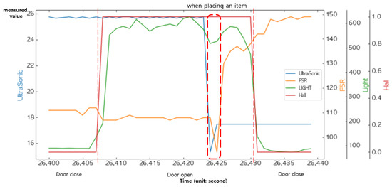 To determine the state of the smart storage, a pair consisting of an FSR sensor and an ultrasonic sensor and a pair consisting of a light sensor and a Hall sensor were combined, respectively. An FSR sensor and an ultrasonic sensor were fused together to discriminate whether an item was placed in the smart storage. Notice that when an item is placed, the distance to it measured by an ultrasonic sensor decreases. A light sensor and a Hall sensor were combined to determine the door’s state. When the door is opened, the illuminance sensed by a light sensor increases. The sensed value of the Hall sensor was 1 when the door was open and 0 when it was closed.