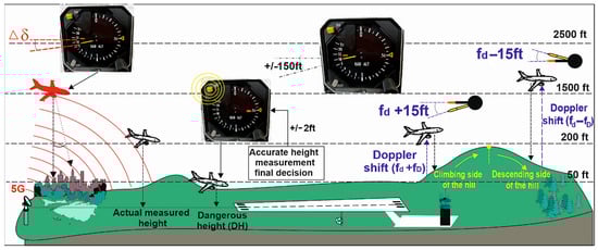 One of the most critical parameters in terms of flight safety is the knowledge of the actual (radio) altitude of the aircraft above the surrounding terrain. This information is obtained from radio altimeters (ALT), which have been used in aviation since 1938 [1,2]. The principle of radio wave reflection from the earth’s surface enabled very accurate altitude measurements and much higher accuracy than measuring altitude with barometric altimeters or GNSS (geometric altitude vs. real altitude). Information about the radio altitude of the vehicle is critical not only for pilots in the approach and take-off phase in all meteorological conditions (Figure 1) but also for several avionics systems such as automatic flight control systems (Automatic Flight Guidance and Control Systems, Stick pusher/shaker, Flight Director, Thrust reverse, Autothrottle, Flight Controls, Envelope Protection Systems), anticollision systems (Enhanced Ground Proximity Warning Systems—EGPWS, Traffic Collision Avoidance Systems—TCAS, Windshear detection systems, Tail strike prevention system), and assistance aircraft systems (Primary Flight Display of height above ground, Take-off guidance systems, Engine and wing anti-ice systems) [2,3]. A radio altimeter (ALT) failure or malfunction can result in a disaster [3,4,5].
