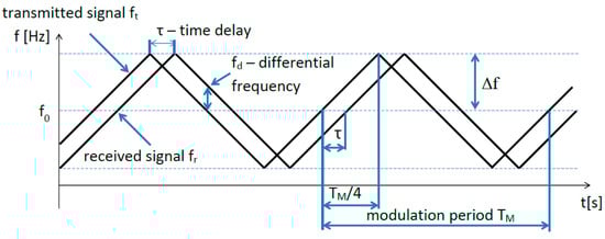 In the equation, the height Hr is doubled because the signal travels this distance twice—the signal passes from the aircraft to the ground (downwards) and from the ground to the plane (backwards). The radiated, reflected, and received signal still has the same frequency even after a time delay τ. The received signal meets the currently transmitted signal at the receiver’s input (in the mixer stage) [14]. However, the transmitted signal has shifted from the original frequency of the received signal during the time τ because of the frequency modulation (Figure 2). The instantaneous frequency difference between the transmitted signal and the received signal is proportional to the measured height (Equation (2)).