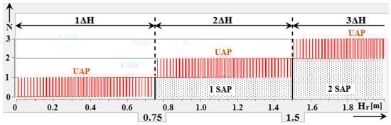 Figure 5 shows the simulation results for which input parameters were defined corresponding to the operating parameters of current radio altimeters. A problem related to a methodological error is highlighted in this simulation output. Only 44 unstable altitude impulses (UAP) exist in the range of measured height (0.0–0.75 m). In the range of measured height (0.75–1.5 m), there are another 44 unstable altitude impulses (UAP) but also one stable altitude impulse (SAP). In the range of 3ΔH measured height (1.5–2.25 m), there are another 44 unstable altitude impulses (UAP) but also two stable altitude impulses (SAP). The number of unstable height impulses in the range can be determined by (Equation (11)) [15]: