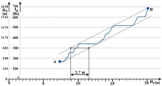 According to the stated relationship and at the stated modulation parameters, it is possible to measure the height in steps of 0.5 cm. When changing the altitude with this step, the difference frequency changes by 1 Hz. For minor altitude changes, the mathematical result is not a solid numerical value of the frequency—for this reason, it is not possible to measure a minor altitude change. From the point of view of practical measurement of the aircraft’s height above the ground (altitude), we could consider such a measurement process (with a discretion step of 0.5 cm) to be ideal.