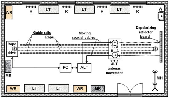 In Figure 8a it is possible to see the measuring station of the ALT system together with the surrounding several metal objects. Figure 8b shows a patented depolarisation panel [22,23,24] with dimensions of 2.2 m × 2.2 m, which changes the polarisation and also serves as a reflecting surface (simulation of the terrain under a flying aircraft). A black U-shaped iron profile can be seen on the floor of the room for the directional guidance of the ALT antenna stand—it ensures the stability of the direction of the antennas in the horizontal plane during their movement. The white-grey E-shaped plastic profile was used to stabilise the direction of the antennas in the vertical plane on the depolarisation panel as they moved during the measurement. The yellow I-shaped plastic measuring band served for a quick visual orientation of the antennas’ continuous position and for determining the start and endpoint of the measurement.