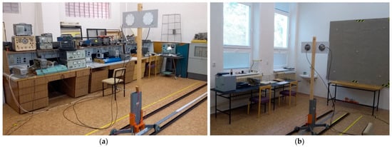 In terms of speed, the highest speed was used in the first measurement (0.56 ). In the second measurement, the speed was medium, i.e., 0.28 , and in the third measurement, the speed was the lowest, 0.14 . The definition of the speed of movement of the ALT antennas, namely high, medium and low speed, is chosen to take into account the dimensions and technical capabilities of the laboratory. In terms of the direction of movement of the antennas, this was realized by reducing the height (distance) by bringing the antennas closer to the polarizing panel [22,23,24]. Or, conversely, by increasing the height (distance) by moving the antennas away from the polarizing panel. Considering the laboratory’s length (7 m) and the necessary technical equipment, it was possible to measure the height (distance) in the range of 5 m.