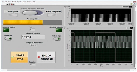 Sensing the current position of the antennas, their speed of movement and the range of measured height was controlled by a computer and using appropriate auxiliary circuits. The guide mechanism stabilised the movement of the mobile stand in the horizontal and vertical planes. Control of height (distance) measurements in the laboratory, control of antenna movement and display of their position, including recording of measured data, was performed with a computer using a DAQ control device from National Instruments, controlled by a program in the LabVIEW environment. A virtual control panel (Figure 9) was implemented on this platform, which controlled and sensed the position of the ALT antennas. The virtual control panel allows you to control the speed and direction of movement of the mobile antenna stand and records the dynamic change in height measured by a radio altimeter. The output data of the measured height from the ALT was connected to the computer using the DAQ converter NI USB DAQ 6216. In this way, it was possible to start and stop the recording of the measured data of the modulation frequency fm and the difference frequency fd. This includes added information about the distance of the ALT antennas from the reference reflecting surface.