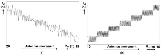 The representation of both records in Figure 10 represents the actual measurement results, and they are for illustrative purposes. They show the difference in measurement at two different speeds and at two different directions of antenna movement. All three presented measurements were performed on one and the same FMCW radio altimeter type RV-5.