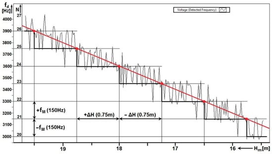 However, the dependence of height measurement is not linear. The problem is related to the principle of frequency modulation. The smallest change in the height of 0.5 cm means an increase in the frequency of 1 Hz, but only within one modulation period (Figure 2). Since the modulation period is repeated x times in the rhythm of the modulation frequency , this means that the number of impulses per unit time N is times larger [15].