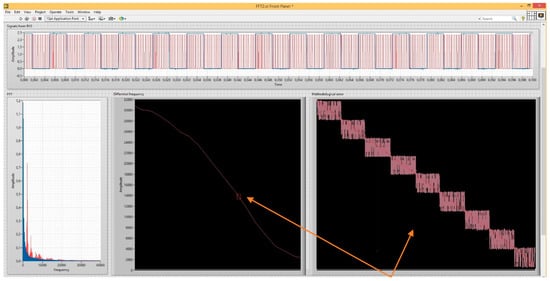 The right side of the control panel consists of displays—oscilloscopes, which show the measured signals of the radio altimeter. They are needed for the graphical display of its methodological error. To graphically display the critical height ΔH, from which is determined the methodological error ALT (±ΔH), it is necessary to know the number of impulses N of the frequency difference fd, within one modulation period TM, and the modulation frequency fm, where . For this reason, at the right bottom (Figure 9), there is a recording of a low-frequency rectangular signal with a modulation frequency of 150 Hz. The result of ALT activity is shaping the difference frequency with the value of units of kHz to tens of kHz, depending on the measured high. The rising edges of this rectangular impulse of the modulation period determine the point for starting the counting of impulses of the frequency difference. It can be seen from this graphic waveform (Figure 9) that the modulation signal overlaps a difference signal of approximately 3 kHz. Impulses are formed from the difference frequency, the number of which (per modulation period) determines the measured height value. The impulses shaped in this way are shown at the top of the record (Figure 9).