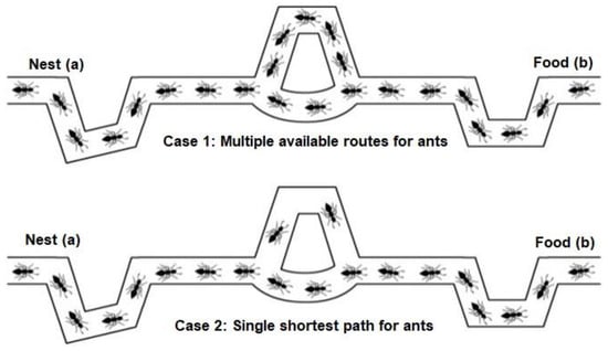 Searching for food in insects is common in nature, where each species has their own natural procedure to follow. The most famous species in search of food are ants, due to their unmatched behavior [,,]. The Ant Colony Optimization (ACO) algorithm gives a comprehensive food searching performance of ants []. In this algorithm, the social behavior of ants presents mathematically to find the optimal solution for the target. Initially, the ants distribute in different clusters and follow all possible paths to reach the food. In this journey, all ants leave pheromone (a chemical substance) along the route to help other following ants. After the first round, all the ants will try to follow the shortest route in consecutive rounds []. Thus, after specific rounds, a single shortest route allowed the ants to follow from the initial point to the target as shown in Figure 2.