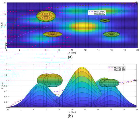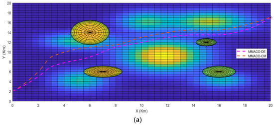 To determine the best algorithm for case 2, both UAVs start from different locations and are allowed to choose their own shortest path according to their approaches. Figure 5 describes the path obtained by UAV1 and UAV2 from the initial point to the target point in a 2-dimensional system. As we can see in Figure 5a, the path constructed by the MMACO-DE is again shorter than the MMACO-CM and has fewer turns.