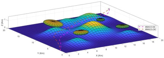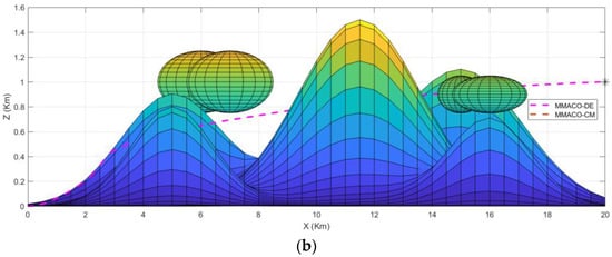 The 3-dimensional view for case 2 is shown in Figure 6 which provides the sense of flying in a dynamic environment including obstacles such as wind forces and mountains with different peaks. Again, it is clear from Figure 6 that MMACO-DE takes fewer turns, hence saving time and minimizing the distance.