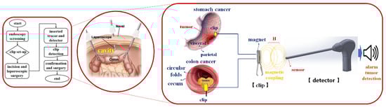 This study proposes a ferromagnetic clip and clip-detection sensor that can simultaneously locate malignant tumors in the stomach and colon quickly and accurately. The clip is constructed using a ferromagnetic material to ensure sturdiness and miniaturization, such that it can pass through the working channel (diameter: 4 mm) of a gastroscope and trocar. The introduction presents the motivation for the research, Section 2 and Section 3 describe the design methods and experimental results, and Section 4 and Section 5 present the discussion and conclusion.