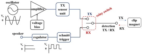 As a result, ω1 and H1 generated from the sensor are coupled to ω2 and H2 generated from the neodymium magnet to form H1 and H2 as shown in Equation (4), and ω1 and ω2 become ω0 as shown in Equation (5). Therefore, signals are exchanged (TX/RX) between the sensor and the clip (neodymium magnet) [17].