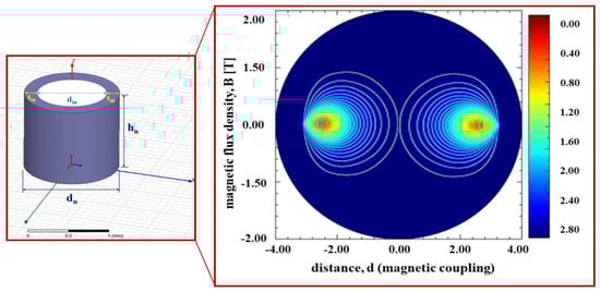A neodymium magnet is a magnet with the strongest magnetic force among permanent magnets. Neodymium magnets have excellent machinability of various shapes. Therefore, the neodymium magnet is made of iron and boron, and it has the maximum magnetic energy among permanent magnets. Due to the ferromagnetic properties of the neodymium magnet, a strong magnetic flux density (B2) is generated as in Equation (1), and the magnetic field (H2) increases. Therefore, as in Equation (3), the neodymium magnet operates as a magnet by generating a strong magnetic force (F). At this time, D means the size of the neodymium magnet, and as the size of the magnet increases, the magnetic flux density (B2) increases. Thus, the magnetic field H2 will increase, and the magnetic force F will increase. Additionally, a magnetic field (H2) is generated along with the induction frequency (ω2) [15].