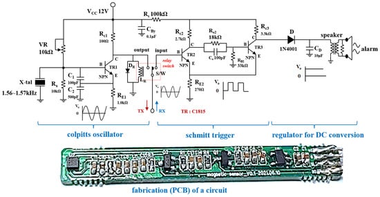 Figure 6 shows the schematic circuit and fabricated printed circuit board containing the clip–detector. As shown in the figure, the circuit consists of a Colpitts oscillator, amplifier, Schmitt trigger, regulator, relay switch, and speaker.