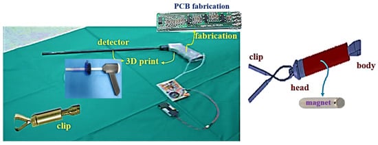 In addition, the magnet for locating the tumor is inserted into the clip, as reported in [11,14,16], and it is designed to be integrated. This allows the detection module to be wirelessly connected to the clip. Therefore, the errors are minimized when the detector locates the clip. More specifically, if connected with a wire, the error in locating the clip is the maximum of the length of the wire [12,13,15]. However, since the designed clip is connected wirelessly, the error in the position of the clip is reduced. In addition, the proposed clip–detector can locate tumors in the stomach and colon as in [11,14]. That is, refs. [11,14] have the greatest advantage in that they can find both the clip positions for the stomach and colon at the same time. However, the clip–detector can locate the tumor accurately and quickly.
