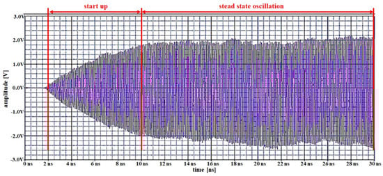 The oscillations produced by the designed Colpitts oscillator are shown in Figure 8. The oscillation jogging is divided from oscillation start-up to oscillation steady-state oscillation. Herein, the start-up range is from 2.0 to 10 ns and the steady-state ranges from 10 to 30 ns. Therefore, the operating range voltage at start-up is 0–2 V, and that of the steady-state oscillation is maintained at 2 V. The steady-state oscillation, therefore, becomes a stable frequency source that is supplied to the magnet in the clip.