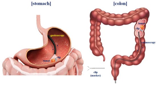 In laparoscopic surgery, malignant tumors present in the colon (or stomach) interior (circular folds or visceral) are not visible outside (cecum or parietal) of the colon, so it is not easy to locate the tumor in the cavity [4]. Therefore, to locate the tumor on the inner wall of the stomach (circular folds or visceral), the tumor is located through an endoscope three days before surgery (flow chart on the left), as shown in Figure 1, and then the clip is pre-installed around the tumor. Then, during laparoscopic surgery, the trocar is docked to locate the detector (picture on the right) and the clip present inside the colon (or stomach) in the cavity.