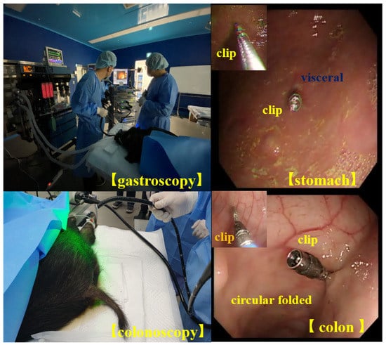 To test the performance of the designed clip–detector, we conducted animal experiments on a male mini pig (farm) that weighed 40 kgs. The animal was supplied by the experimental animal center of KNOTUS (Songdo Research Center, Incheon, Republic of Korea). We sent an animal institutional review board (IRB) permission request to the animal ethics commission (KNOTUS–IACUC–20–KE617). For this experiment, four clips were installed in the visceral cavity of the mini pig, i.e., in the middle circular muscular layer of the stomach and cecum: sigmoid colon using a gastroscope or colonoscope, as shown in Figure 11.
