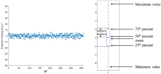 Direction-finding error in different directions (SNR = −10). (a) Error scatter plot. (b) Error box diagram.