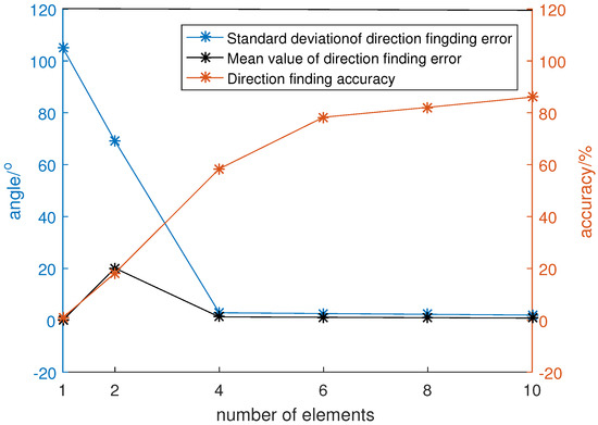 The results suggest that the accuracy of direction-finding is very sensitive to the number of elements. When the number of array elements was increased from 1 to 10, the direction-finding accuracy continuously increased from to . This is because when the number of array elements was too small, taking a single-element array as an example, the number of elements was equal to the number of incident waves, so the covariance matrix of the received data could not be decomposed into signal space and noise space, and the orthogonality of the two spaces could not be used for direction finding, resulting in the failure of the MUSIC algorithm. With the increase of the number of array elements, the redundancy of the received data increased. The covariance matrix of the data could be decomposed into signal space formed by the eigenvectors corresponding to one signal and noise space formed by the eigenvectors corresponding to the noise. Multiple linearly independent noise vectors could make the noise space more robust to finite data length and amplitude errors. At the same time, when the number of elements increased, the gain performance of the array was also significantly improved, so the estimation of the noise space using received data was more accurate, and the direction-finding accuracy increased with the increase of the number of array elements.