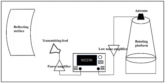 The pattern of the directional helical antenna array is very important to the direction-finding performance of the proposed algorithm. The microwave anechoic chamber can shield external electromagnetic interference. The absorbing material inside the anechoic chamber has a good effect on electromagnetic wave reception and can effectively suppress refraction and reflection. The detection system consisted of a shielded shell with a length of 19 m, a width of 8.5 m and a height of 8.5 m, an N5225A vector network analyzer, a reflecting surface, a turntable, a power amplifier, a low noise amplifier and a feed source. The vector network analyzer was connected to the emitting feed source through the power amplifier. The emitted electromagnetic wave was converted into a plane wave by the reflecting surface and propagated to the antenna. The antenna to be tested was connected to the vector network analyzer through the low-noise amplifier for data analysis. The measurement of the XOY surface pattern of the antenna was completed by controlling the rotation of the turntable via an industrial PC. The specific detection system is shown in Figure 9.