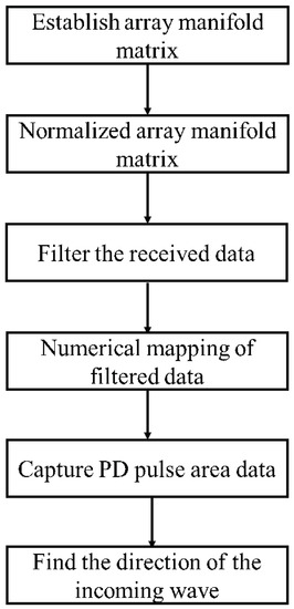 The positioning algorithm flowchart is shown in Figure 13. First, the array manifold is composed of the measured pattern of a single element. Then, based on digital filtering technology, the original data are subjected to band-pass, and the pulse waveform area data are intercepted and input into the algorithm module to estimate the direction of the incoming wave. In the algorithm module, the filtered data needs to be mapped to the interval to suppress the dependence of the received signal amplitude on the distance of the discharge source, so the received data and the array manifold have the same influence on the direction-finding results.