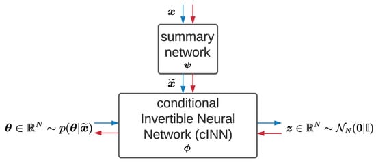 BayesFlow Architecture. contains the network parameters of the summary network, the network parameters of the cINN. The blue arrows stand for the forward process; the red arrows stand for the inverse process.