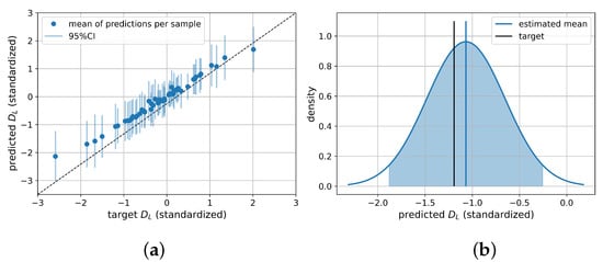 Performance of ResNet PBNN on test set for ; (a) scatter plot with 95%CI as error bars; (b) density plot for test observations composed of 100 evaluations of one sample. The highlighted area represents the 95%CI, the dashed line the target, the solid line the mean estimate.