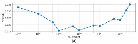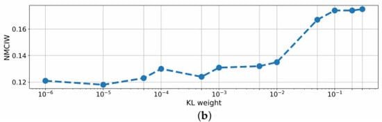 (a) NRMSE and (b) NMCIW for BNN prediction of on the test set using different KL weights during training.