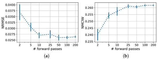 (a) NRMSE and (b) NMCIW of PBNN in prediction of with varied number of forward passes. Error bars show the standard deviation over 10 iterations.