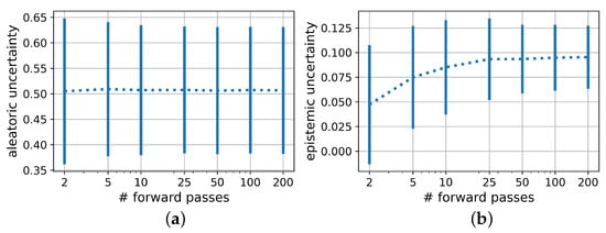 (a) Aleatoric and (b) epistemic uncertainty with number of prediction passes. Error bars show the average over standard deviations.