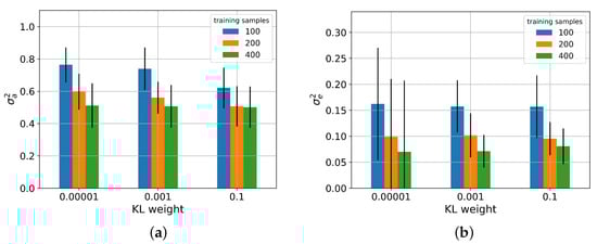 Aleatoric (a) and epistemic (b) uncertainty components of PBNN under variation of the training set size and the KL weight.