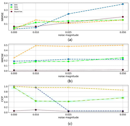 (a) NRMSE, (b) NMCIW, and (c) CICP plotted for each magnitude of white noise added to the test set in the prediction of . All noise variants were included in the training set.