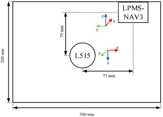 LPMS-NAV3 is an IMU sensor based on the MEMS technology with a three-axis gyroscope and three-axis accelerometer to measure its rotation rate and acceleration with respect to the inertial frame at 100 Hz. In the paper, the white noise and a slowly varying sensor bias are considered. The rotation matrices are calculated by using Forster et al.’s on-manifold pre-integration theory [33]. Figure 1 shows the layout of the sensors.