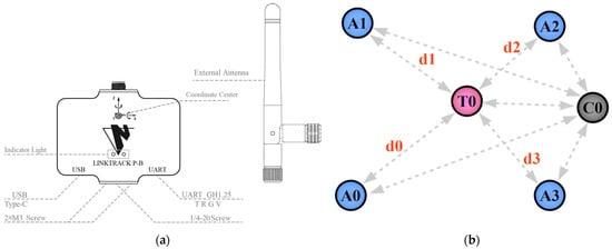 (a) Structural diagram of anchor; (b) Local positioning working mechanism. The A0 to A3 represent four anchors, T0 is a tag, and C0 denotes a console. The d0 to d3 represent the distance between two nodes.