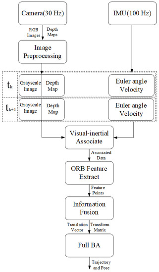 The proposed algorithm architecture is shown in Figure 4. In this approach, the camera images, including RGB images and depth maps, are collected with the live timestamp. After the process of image filtering and grayscale conversion, the quality of the images is improved. The recorded data, including the rotation rate, the RGB images, and the depth maps, are associated by the timestamp. Then, the features are detected and tracked through the ORB descriptor, and are converted into 3D space by using the depth maps. The translation vector between the two continuous frames in a series of RGB images can be calculated. Subsequently, the translation vectors and rotation matrices are corrected by the bundle adjustment algorithm.