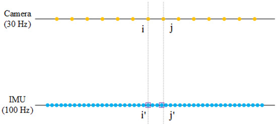 In the data association process, the frequency of recording RGB images and depth maps is 30 Hz, while the frequency of the IMU is 100 Hz. In this case, the camera data are intended to be associated with the IMU data by the timestamp. More specifically, as shown in Figure 5, assuming the ith camera frame as the starting point, the IMU data i’ are found by the matching nearest timestamp. A similar process can be completed for the jth camera frame. By this means, each frame captured by the camera is expected to find good matches in the IMU data.
