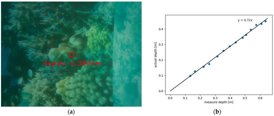 The parameter Z mentioned above could be obtained from the depth map generated by the RealSense L515. The depth measurement is achieved by the laser scanning. In the air, the depth measurement is relatively accurate. However, the speed of light propagation through the water is varied, and the measurement range is also limited, resulting from the underwater scattering phenomenon. To consider the error of the depth measurement in water, a test, as shown in Figure 6a, was conducted. Figure 6b depicts the results, where there is a linear relation between the measure depth and actual depth. By the least square method, as presented in Equations (2) and (3), the linear regression model can be derived. The coefficient b is about 0.72, and the bias coefficient a can be regarded as 0: