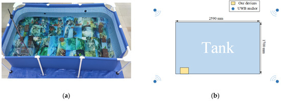 To verify that our algorithm was effective and available in an underwater environment, a series of experiments were conducted in the tank. The size of the experimental tank was 2590 mm × 1700 mm × 610 mm shown in Figure 7a. At the bottom of the tank, the posters were laid to simulate the actual seabed environment with artificial starfishes and sea weed. Besides that, some of the objects, such as starfishes, seaweeds, and artificial structures were also placed on the bottom. In this case, the experimental tank can be considered to be analogous to the real underwater environments. The data collection equipment was introduced in Section 3. The arrangement of the UWB system is shown in Figure 7b: the four UWB positioning anchors are fitted around the tank; the UWB positioning tag is mounted on the data recording device. They were all set up over the tank, so that the obstruction for electromagnetic radiation can be avoided.