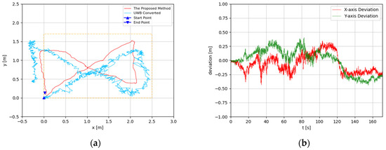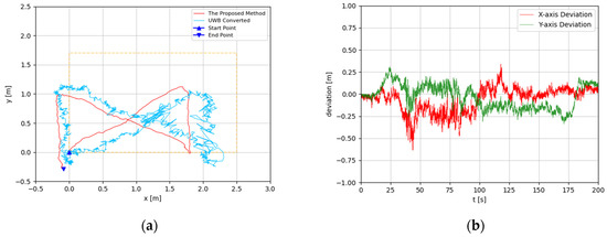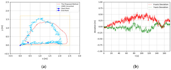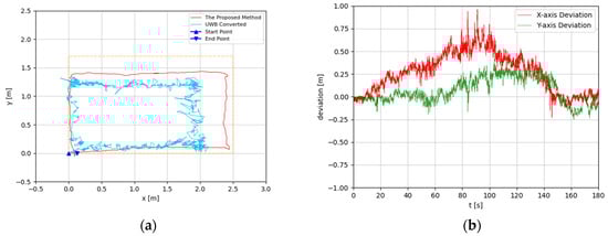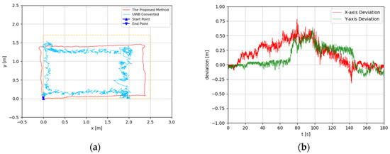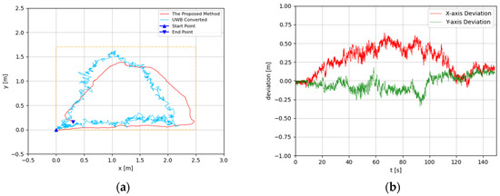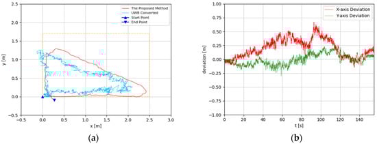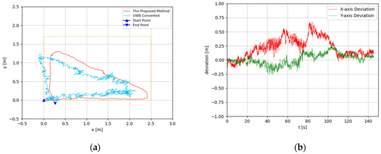 In Figure 10 and Figure 11, the proposed method is evaluated for the general triangle-shaped path. In Figure 12 and Figure 13, the method is verified for the right-triangle-shaped path. The estimated trajectories draw a triangle shape clearly, and the offset of the start point and end point was about 0.35 m. The error ratio was around 5%. In the comparison between the developed approach and UWB positioning system, the largest deviation was around 0.5 m from 80 s to 100 s. Towards the end of the experiment, the deviation was about 0.1 m.